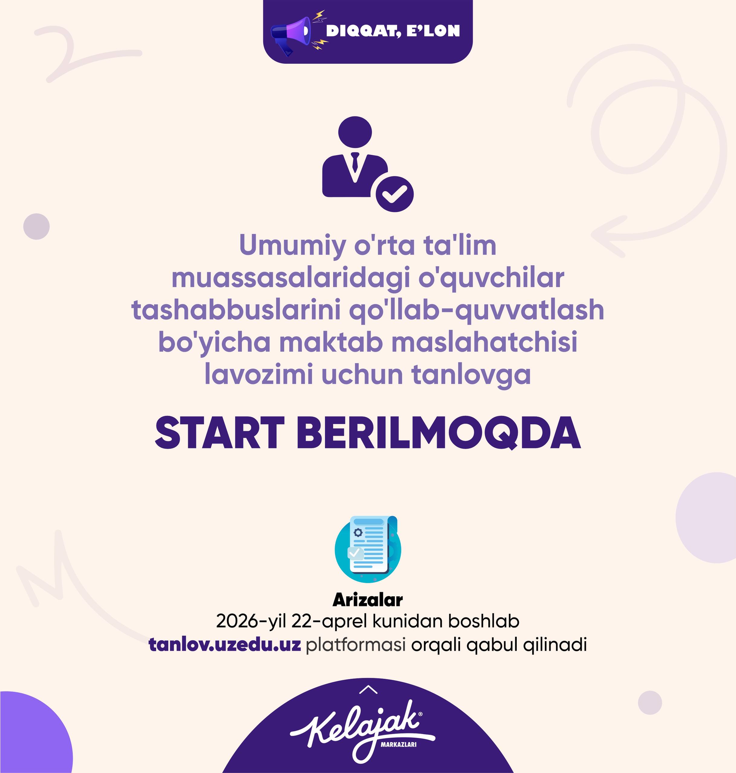 Bolalarni umumta’lim maktablarining 1-sinfiga online qabul qilish jarayoni 2026-yil 20-iyun kuni soat 00:00 da boshlanadi.
